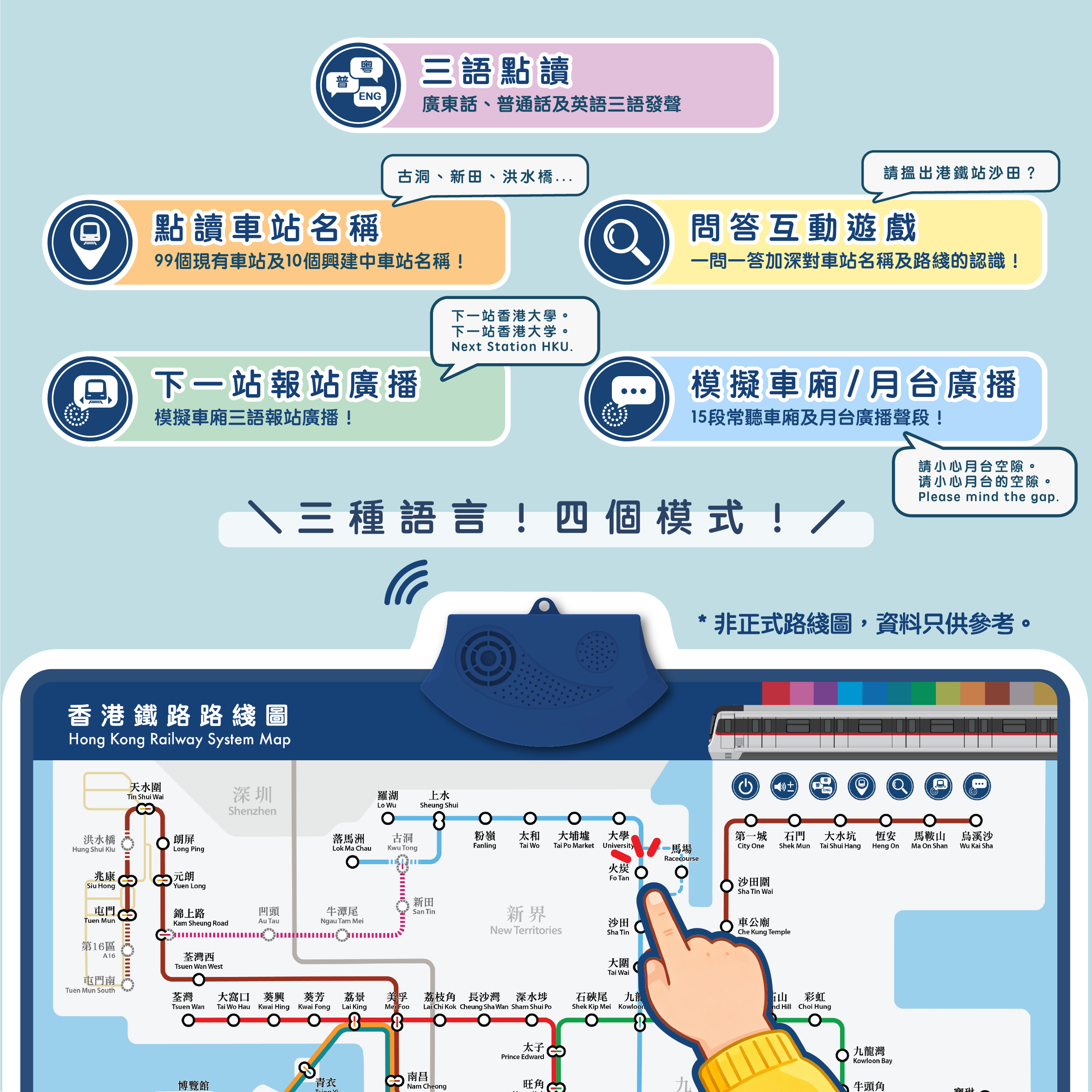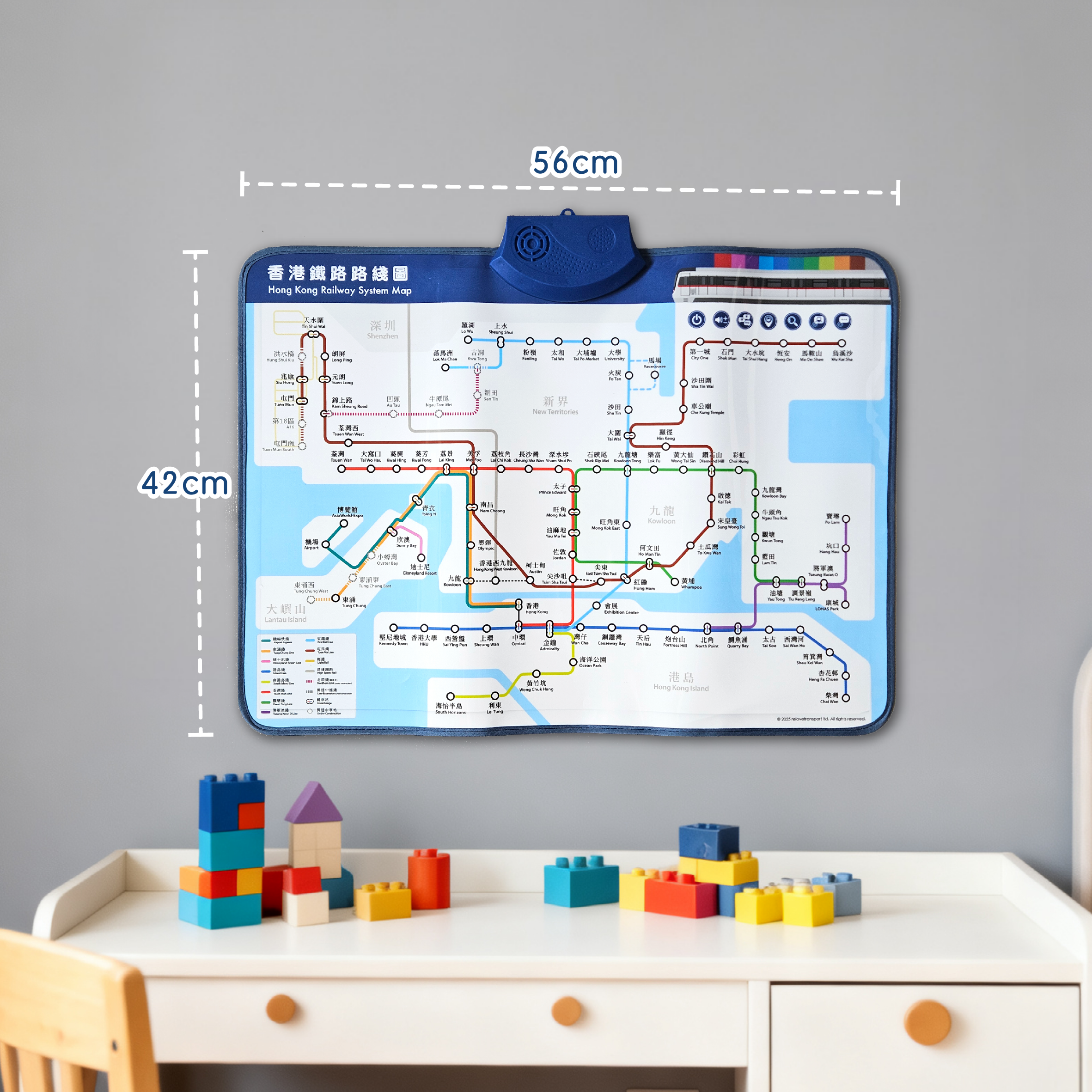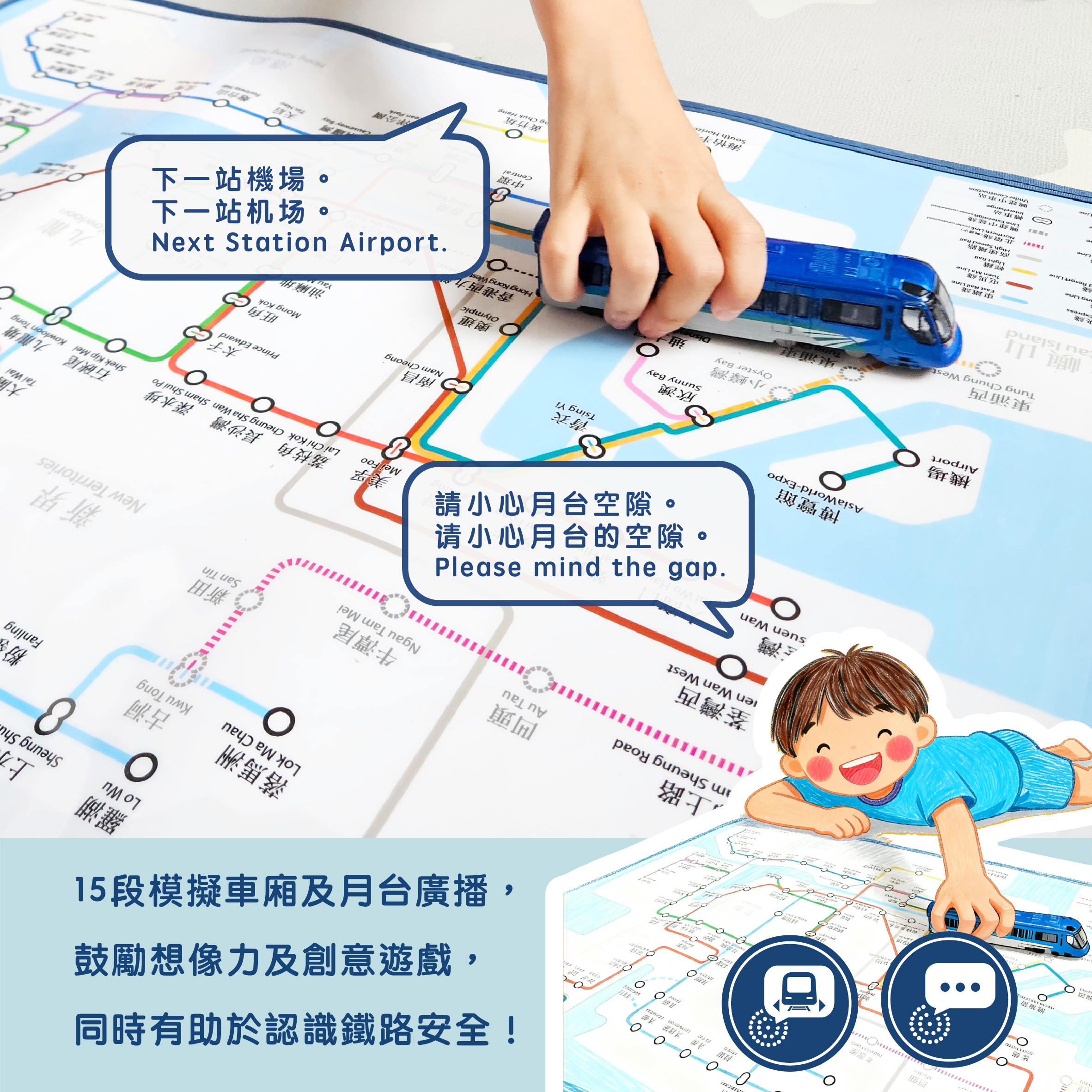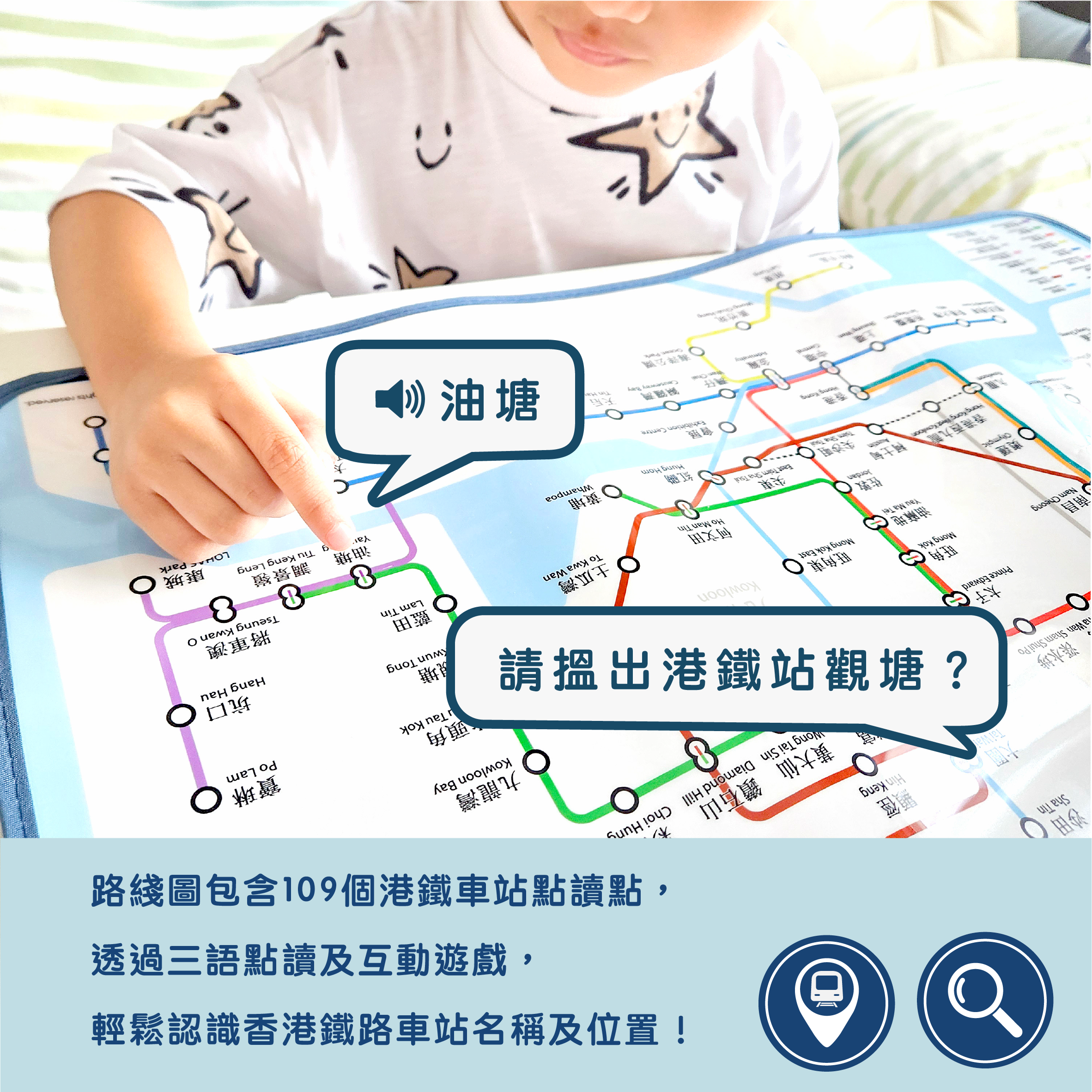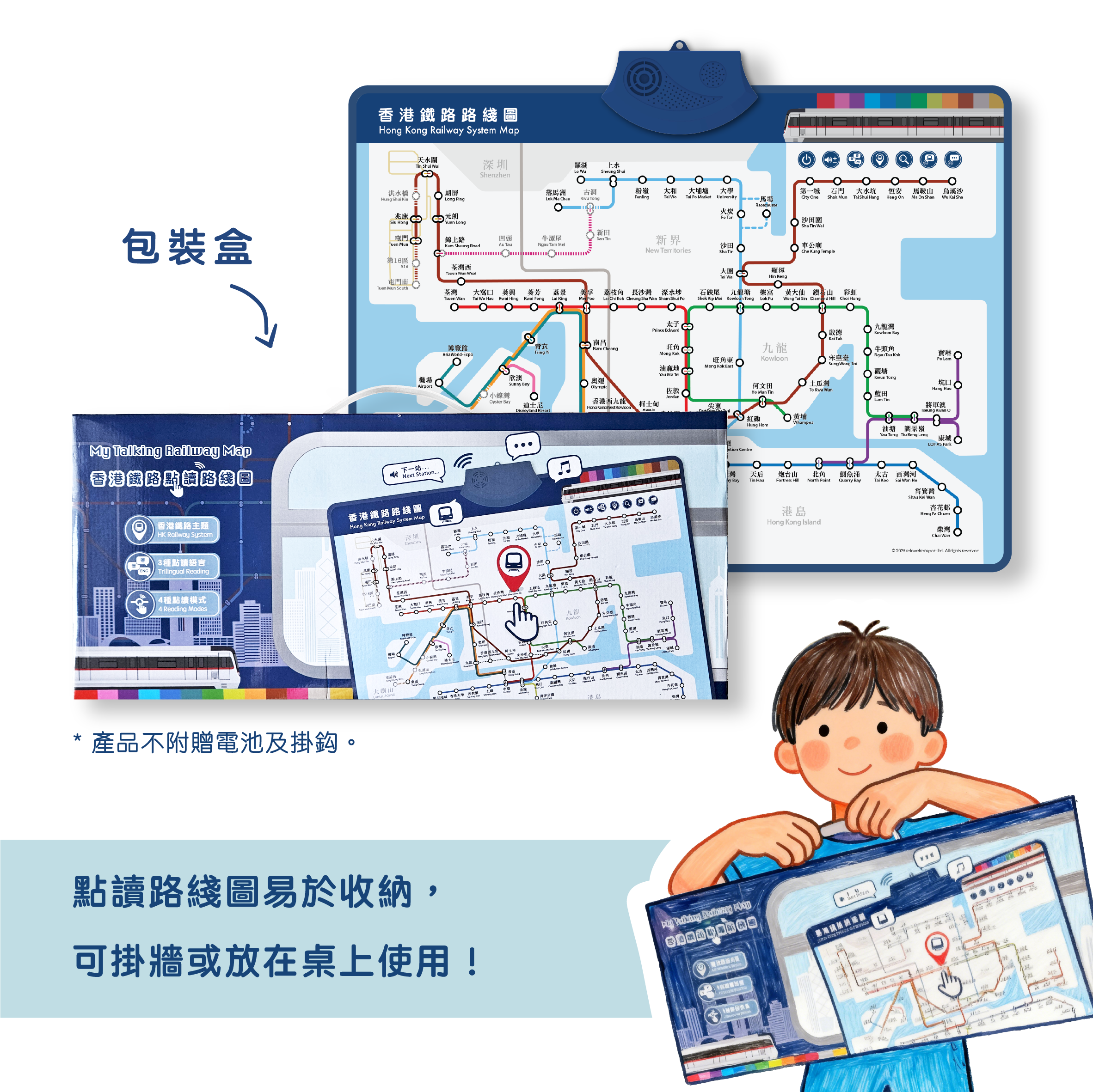 香港鐵路點讀路綫圖 點讀路線圖以三語 (廣東話、普通話、英語) 介紹香港鐵路現有99個車站名稱,並加入目前在興建中的10個新車站名稱,共多達109個點讀點! 除了三語點讀功能外,還設有三語【找一找車站】互動小遊戲,讓小朋友在尋找車站的過程中,加深對車站名稱及綫路位置的認識,同時增添學習樂趣。 點讀圖亦特別編製了兩個模擬廣播模式。【下一站...】模式下會以三語讀出車站名稱,模擬日常在車廂中經常聽到的「下一站...」廣播,讓小朋友彷彿置身於真實的地鐵旅程中! 而【模擬車廂/月台廣播】 模式,則編製了15段日常可聽到的車廂及月台廣播,例如鐵路規則及安全須知等模擬聲段,除了可以加深小朋友對鐵路安全的認識,亦可以運用這些聲段,進行模擬或想像遊戲! 點讀圖呎吋:56cm x 42cm 電池:3顆 AAA電池 ***購買前請留意: 1. 本產品為非官方及非正式路線圖,路綫圖內容僅供參考。 2. 產品預計約12月初到貨,將儘快安排寄出。 3. 本產品不包含電池及掛鈎。